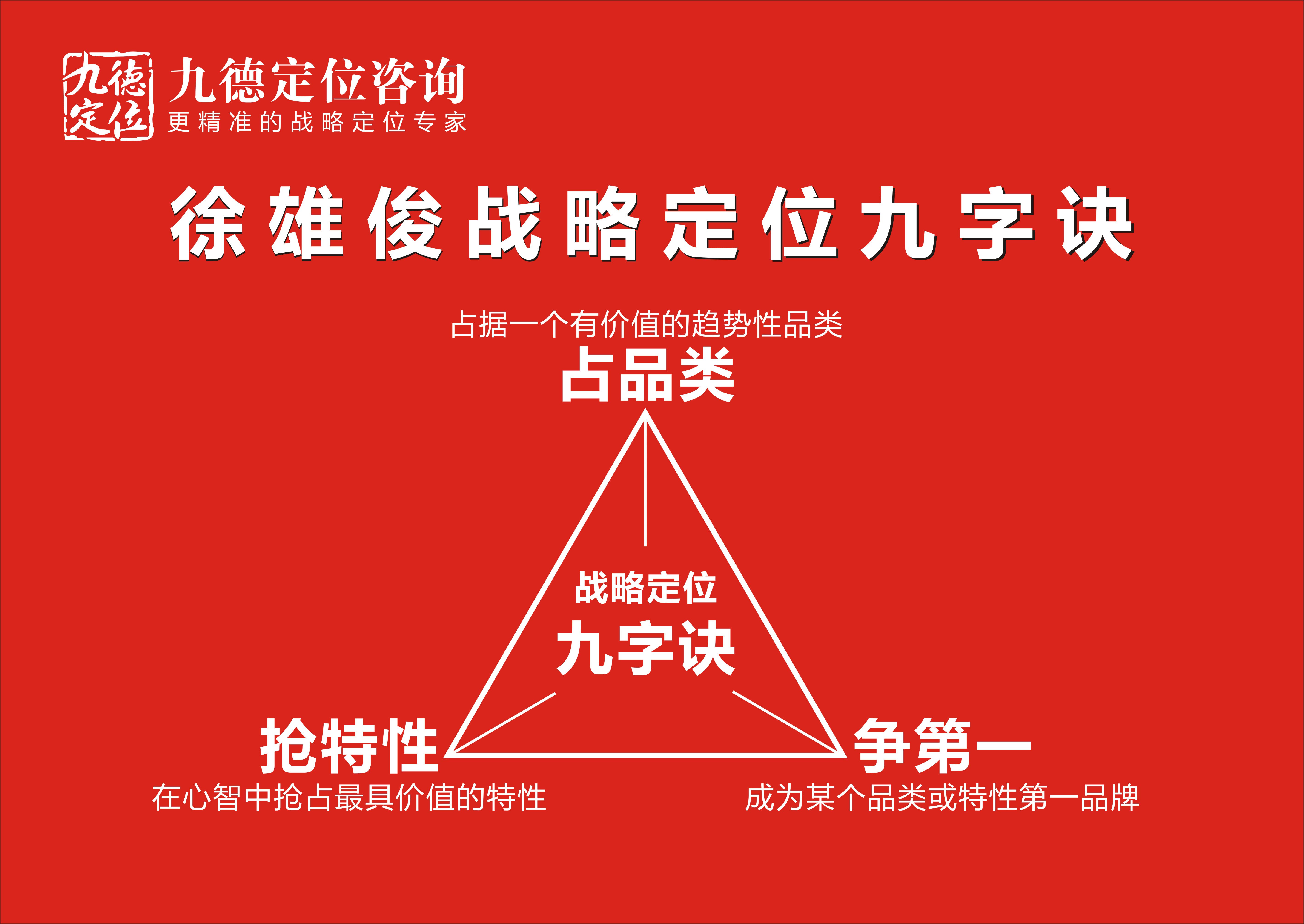 真传一句话,大道至简!请牢记:徐雄俊战略定位9字诀:占品类、抢特性、争第一,九九归一就一个字:心(消费者心智),一起践行天道战略,以消费者心为心,全心全意为客户服务!